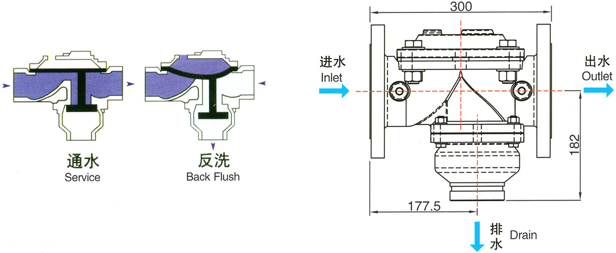2. 雙隔膜腔的液壓驅(qū)動(dòng)控制,應(yīng)用靈活,可適用于包括直角(A)水流和直線(S)水流形式的各種水流方向的切換控制;